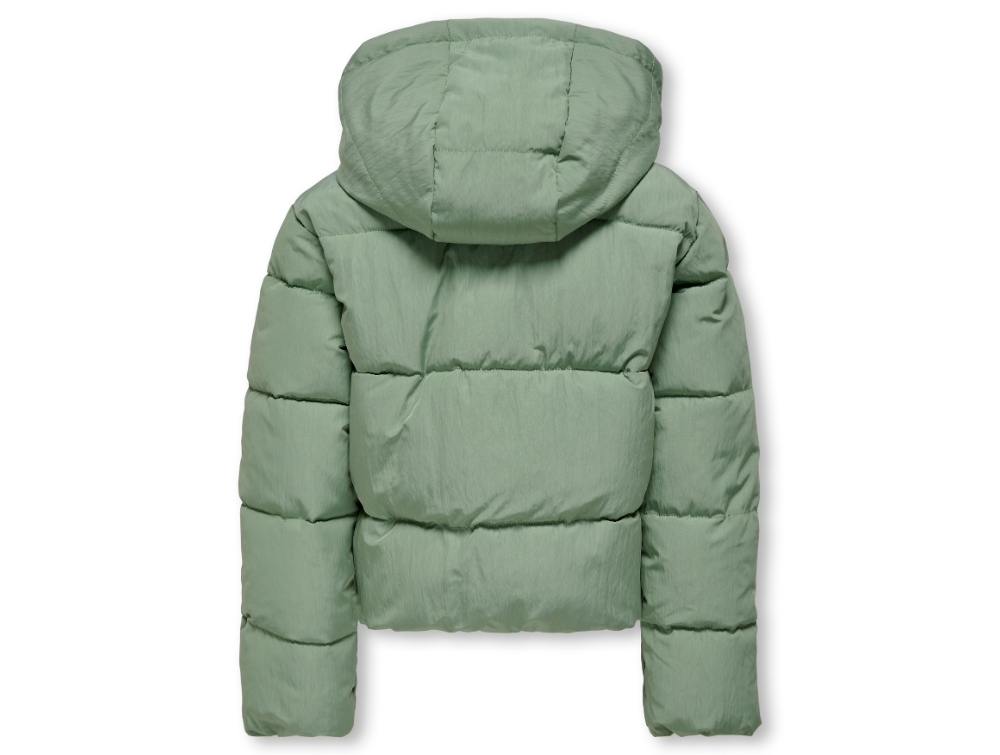 Grøn puffer jakke fra ONLY med hættePige iført ONLY puffer jakke hedge greenOnly puffer jakke hedge green set bagfra