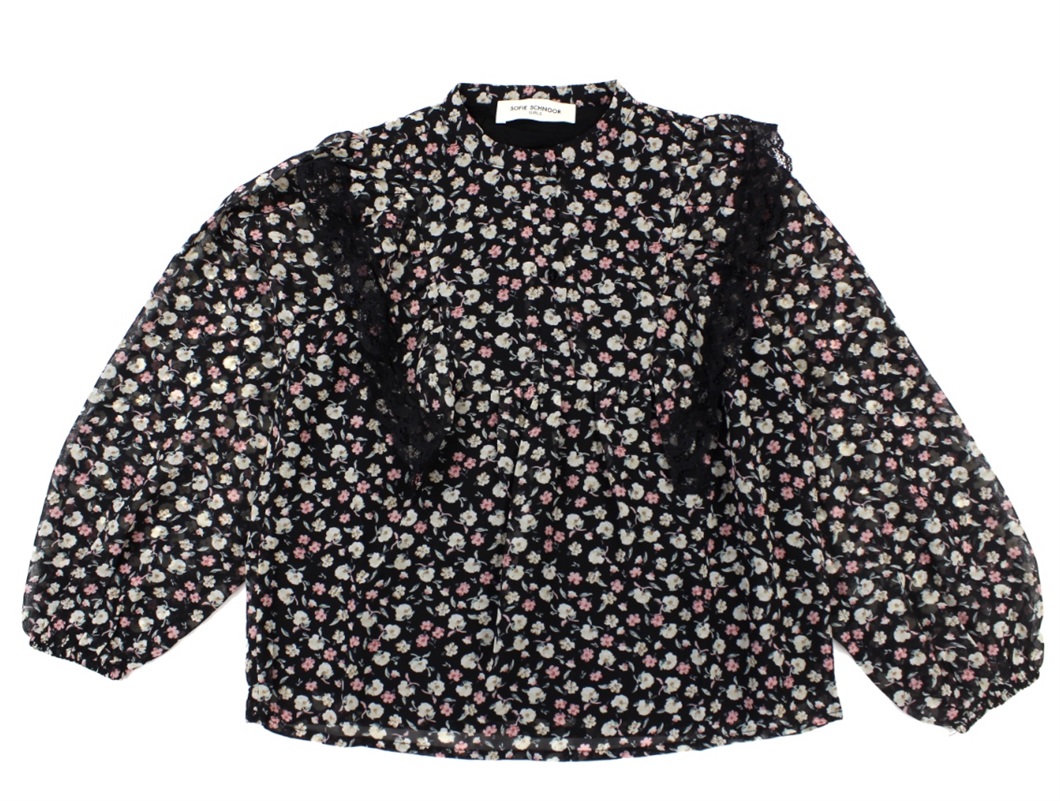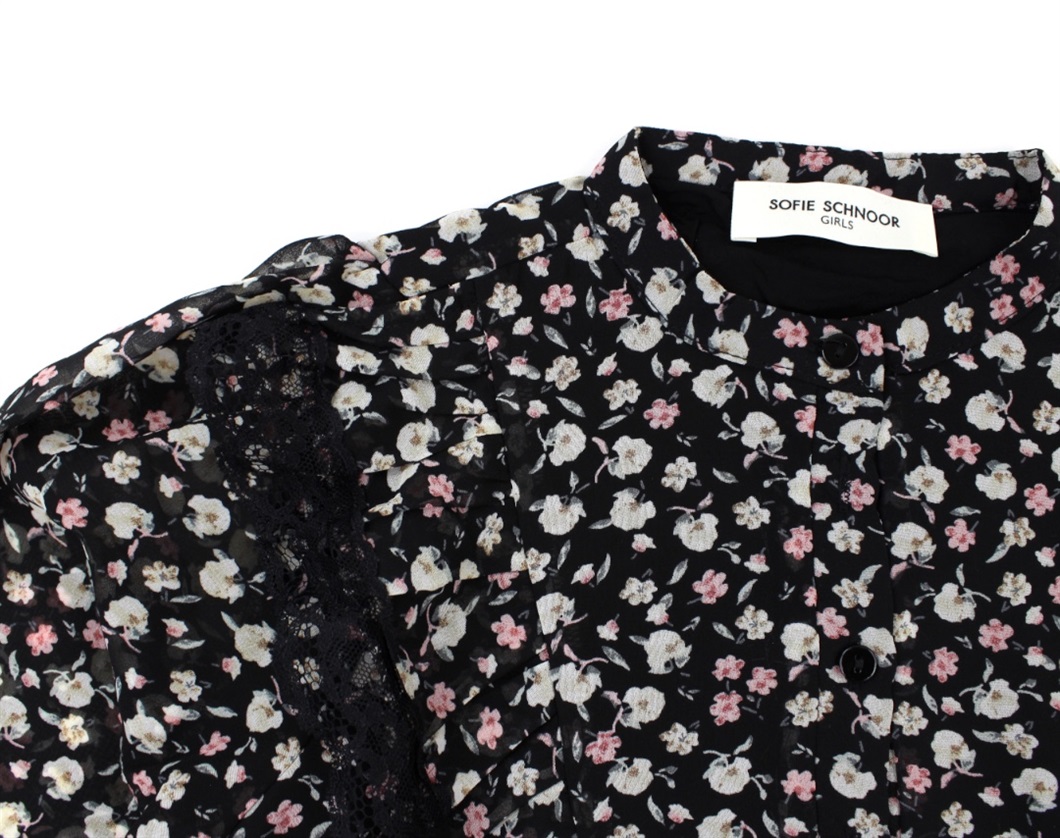 Sort bluse med blomsterprint, blondeflæser og to knapper fra Petit by Sofie Schnoor. Blusen har elastik ved ærmeslut.