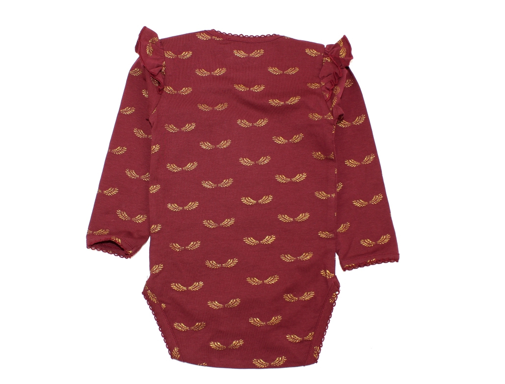 Mørkerød/bordeaux body med guldglimmer print fra Petit by Sofie Schnoor. Flæser ved skuldrene.