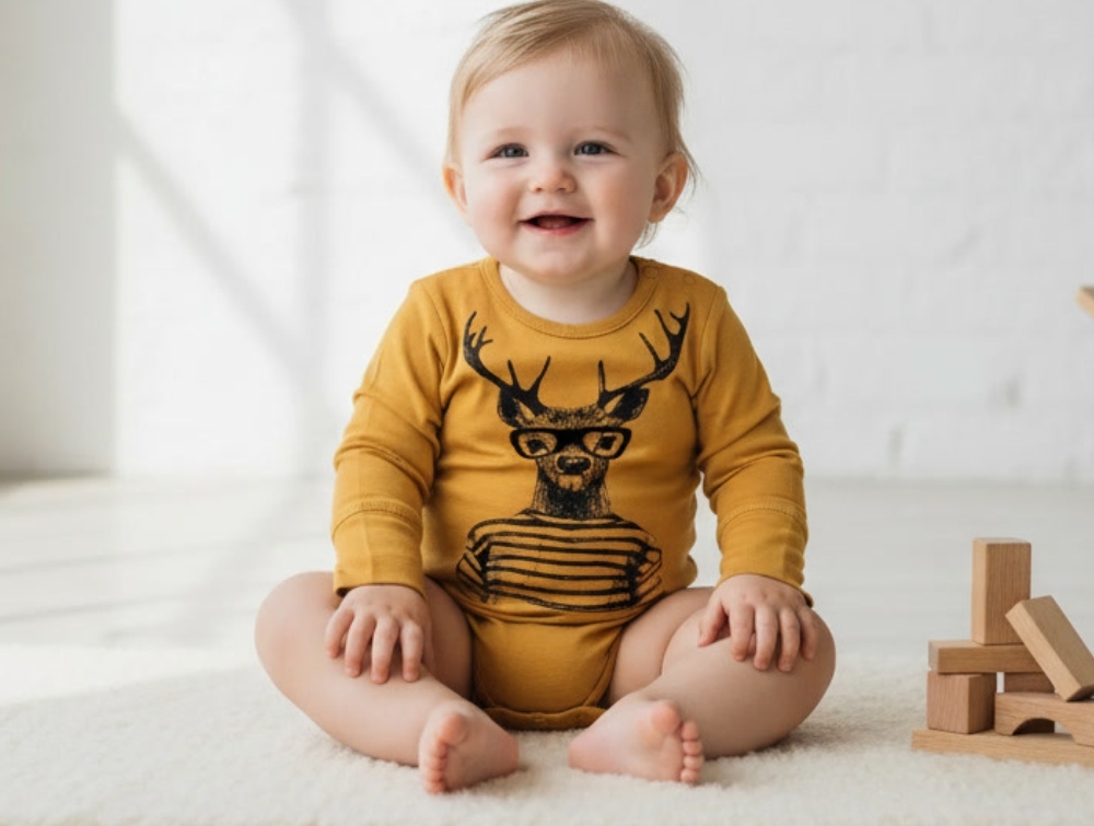 Sennepsfarvet body med rensdyr-print fra Petit by Sofie Schnoor.