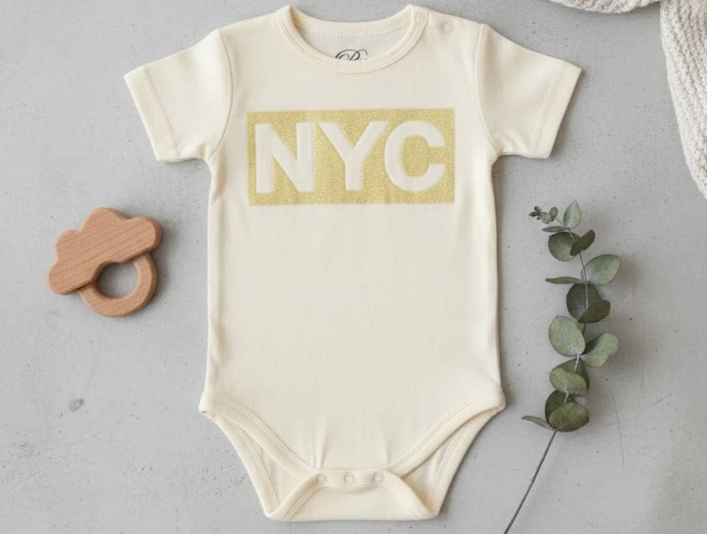 Kortærmet lysegul body med guldfarvet NYC-print fra Petit by Sofie Schnoor.