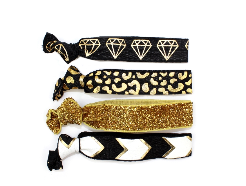Pakke med 4 hårelastikker i guld og sort med mønster og glitter fra Petit by Sofie Schnoor.