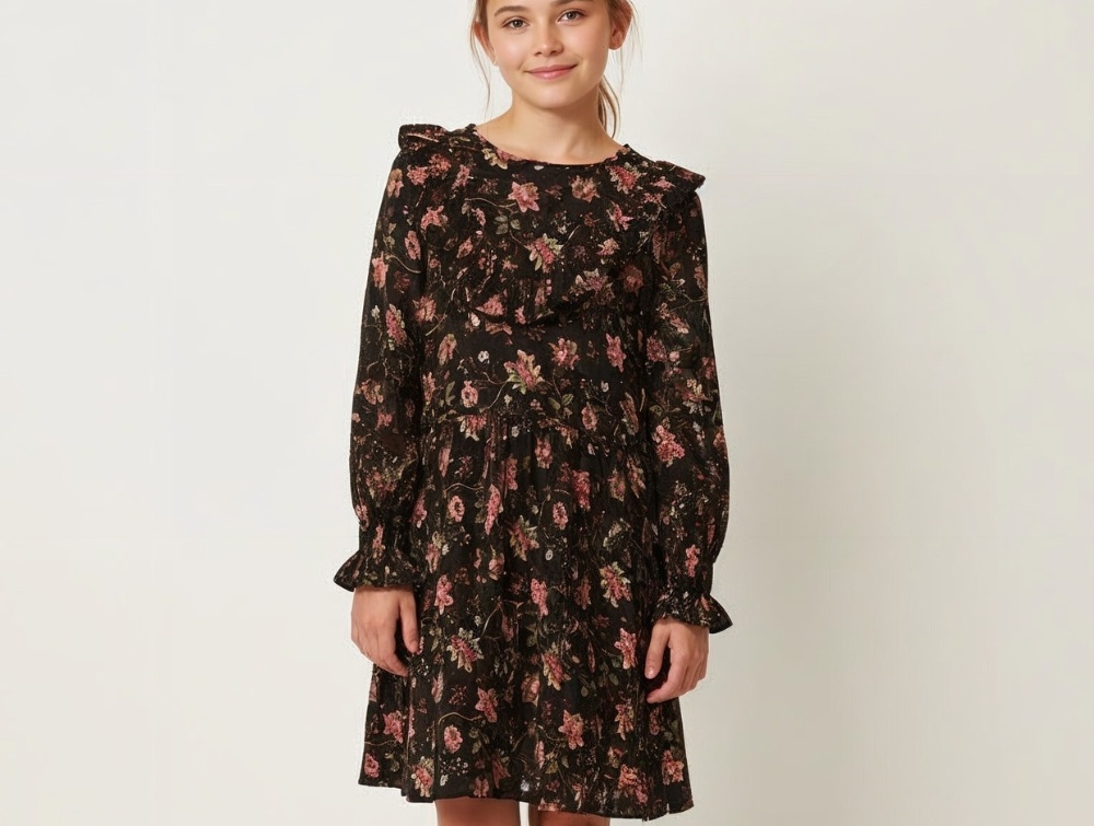 Langærmet sort kjole med blomsterprint og flæser fra Petit by Sofie Schnoor. Bindebånd i taljen og indvendig underkjole.