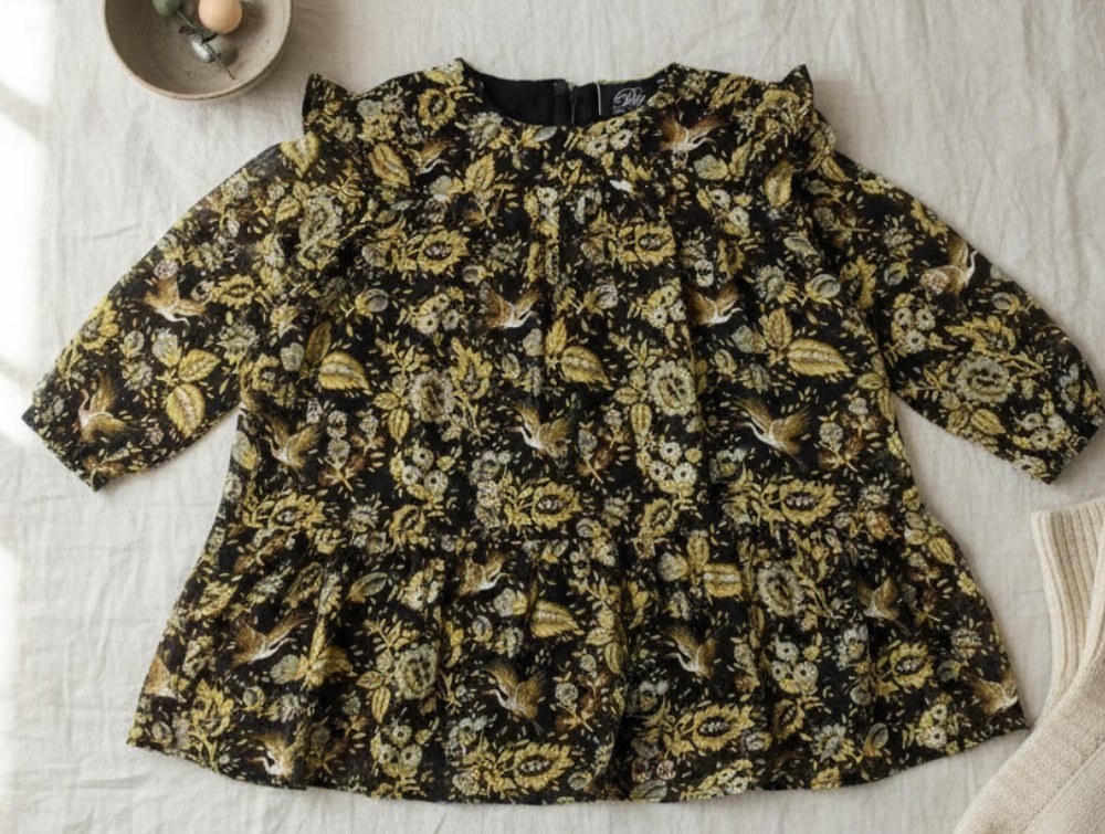 Sort kjole med blomsterprint og guldglitter fra Petit by Sofie Schnoor.