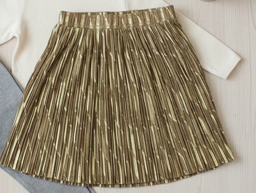 Plisseret nederdel i farverne camel og gold fra Petit by Sofie Schnoor.