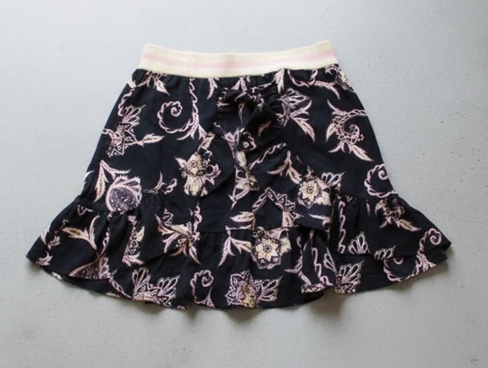 Sort nederdel med blomsterprint og flæser og elastikbånd i taljen fra Petit by Sofie Schnoor.