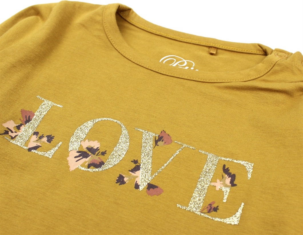 T-shirt i farven mustard med guldprint fra Petit by Sofie Schnoor.