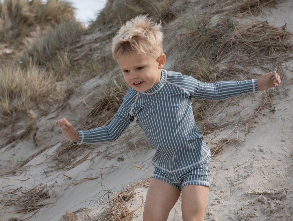 Dreng klædt i blå og hvidstribet badeblue fra Petit Piao PP424 Blue mirage off white Petit Piao badebluse blå mirage med råhvide striber