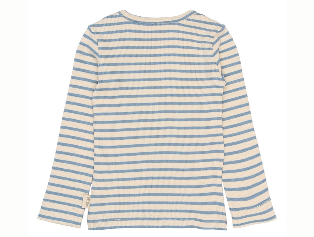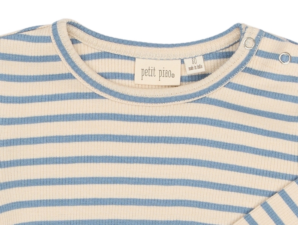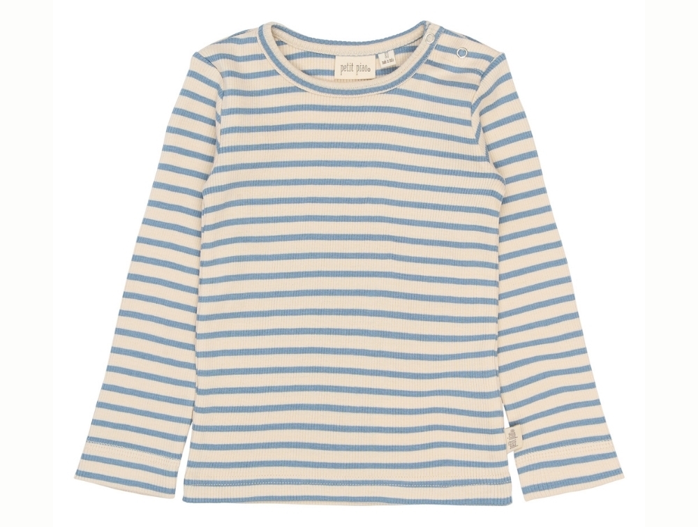 Langærmet bluse i råhvid nuance fra Petit Piao med de klassiske blå striber (Infinity Striped) og ribstruktur.