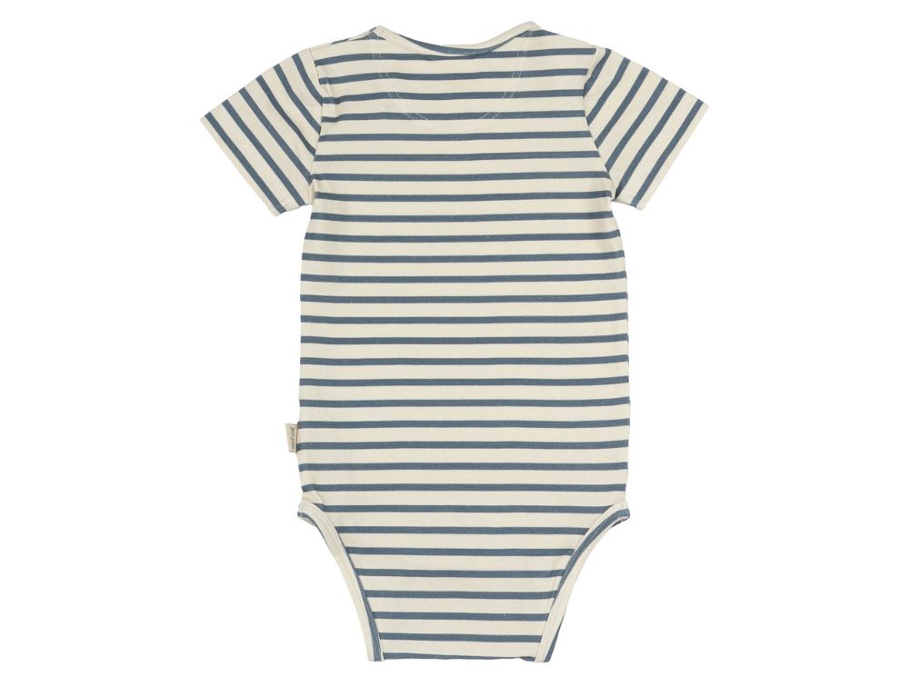 Lille dreng klædt i blåstribet kortærmet body fra Petit Piao PP1704 blue mirageBlåstribet kortærmet body med trykknaplukning i halsudskæringen fra Petit Piao PP1704 blue mirageBlåstribet kortærmet body fra Petit Piao PP1704 blue mirage bagfraKortærmet body fra Petit Piao med blå striber PP1704 blue mirage