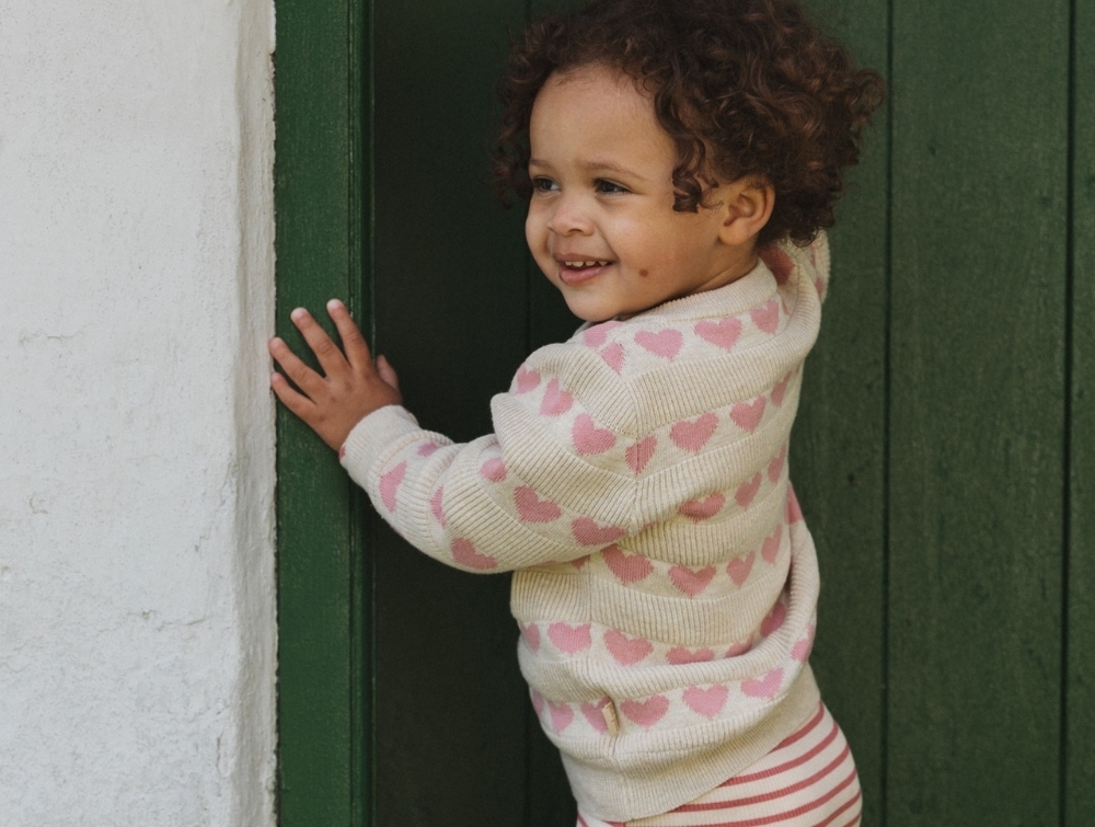 Pige iklædt Petit Piao cardigan med rosa hjerterPetit Piao cardigan råhvid med rosa hjerterPetit Piao strikket cardigan detaljePetit Piao cardigan bagfra
