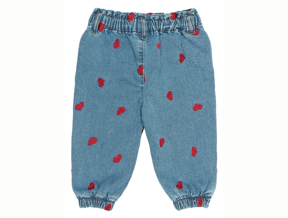 Denim bukser i lys blå vask (light blue denim emb) fra Petit Piao med fine, broderede røde hjerter fordelt over hele stoffet.