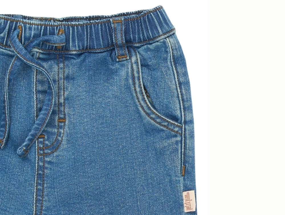 Bukserne har elastikkanter ved anklerne, så de sidder godt omkring benene og ikke glider ned. En let denim, der passer perfekt til både hverdag og leg, og som kan kombineres med sæsonens overdele.