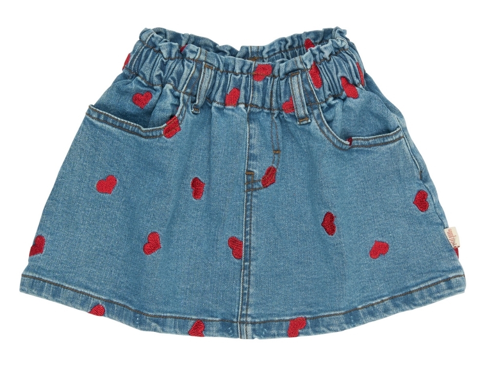 Denim nederdel i lys blå vask fra Petit Piao med søde, broderede røde hjerter.