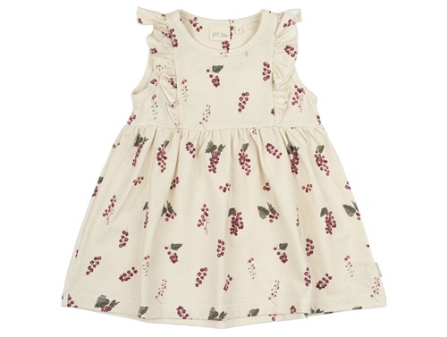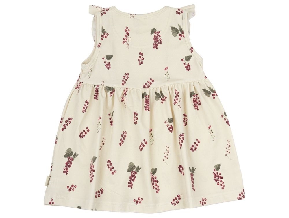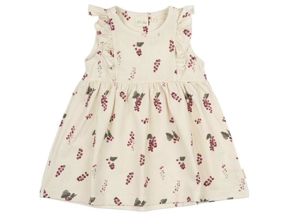 Ærmeløs kjole fra Petit Piao i råhvid med et smukt akvarelprint af røde sommer ribs. Printet er inspireret af den danske natur og giver et charmerende udtryk. I venstre side af halsudskæringen findes Petit Piaos signaturåbning med trykknap, som gør den nem at få over hovedet. Kjolen har to små flæsedetaljer foran og rynk under brystet, hvilket giver ekstra vidde og et feminint udtryk.