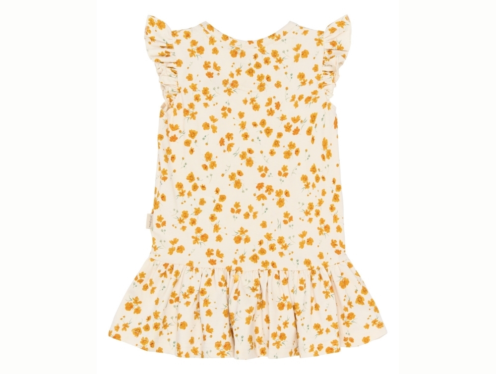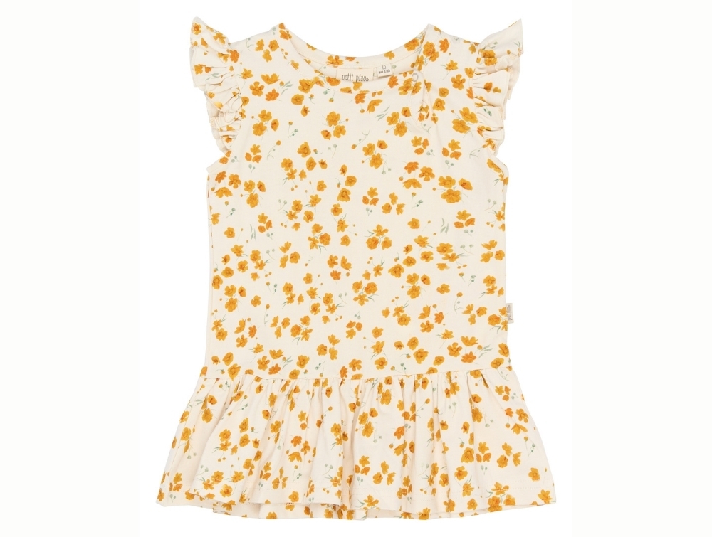 Kjole i råhvid nuance (Eggnog Buttercup ) fra Petit Piao med et fint allover blomsterprint i varme gule nuancer og flæser ved skuldrene.