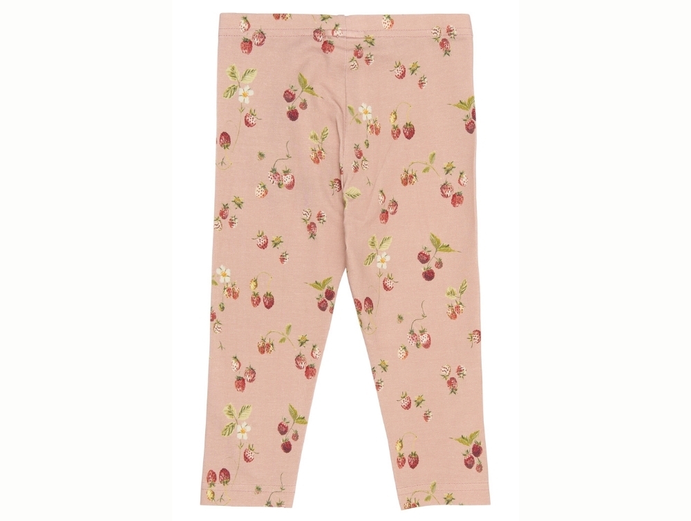 Leggings i rosa nuance (Misty Rose Strawberry) fra Petit Piao med et smukt akvarelprint af små jordbær og fine blomster.