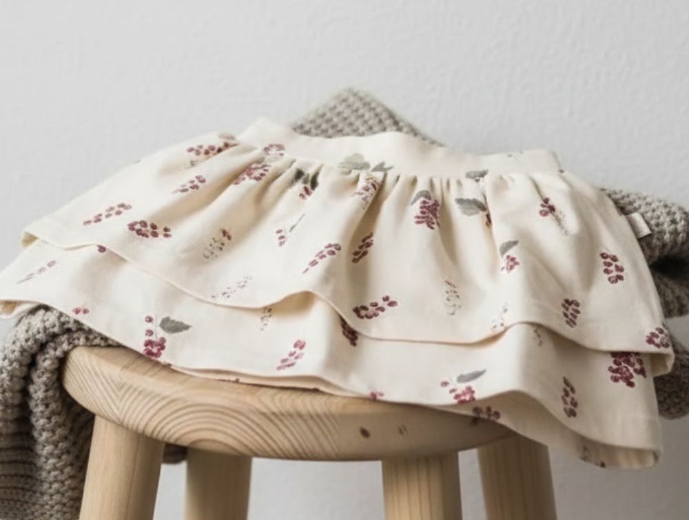 Nederdel fra Petit Piao i råhvid med et smukt akvarelprint af røde sommer ribs. Printet er inspireret af den danske natur og giver et charmerende udtryk. Nederdelen har to lag stof og rynk ved taljen, som skaber en feminin pasform.