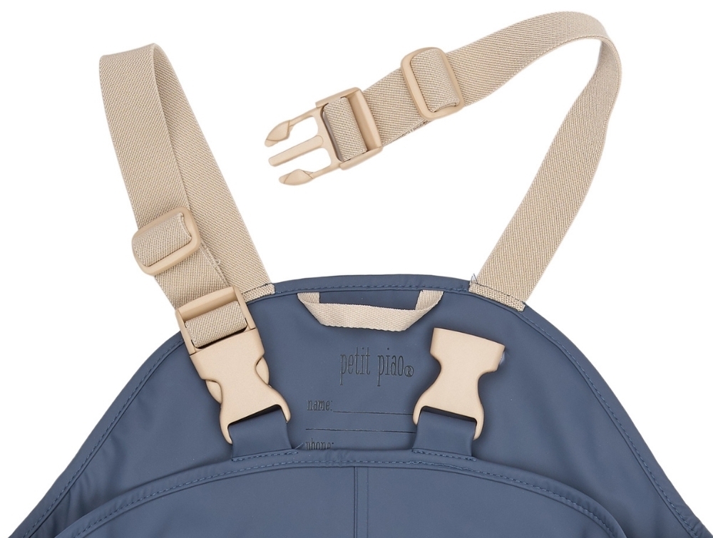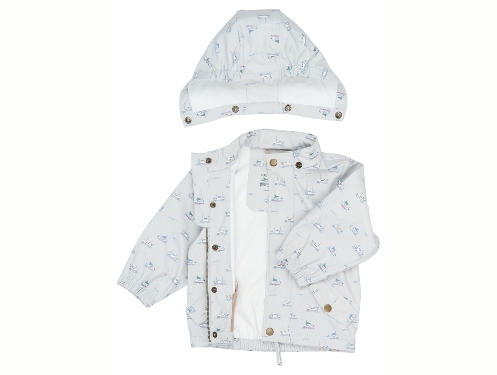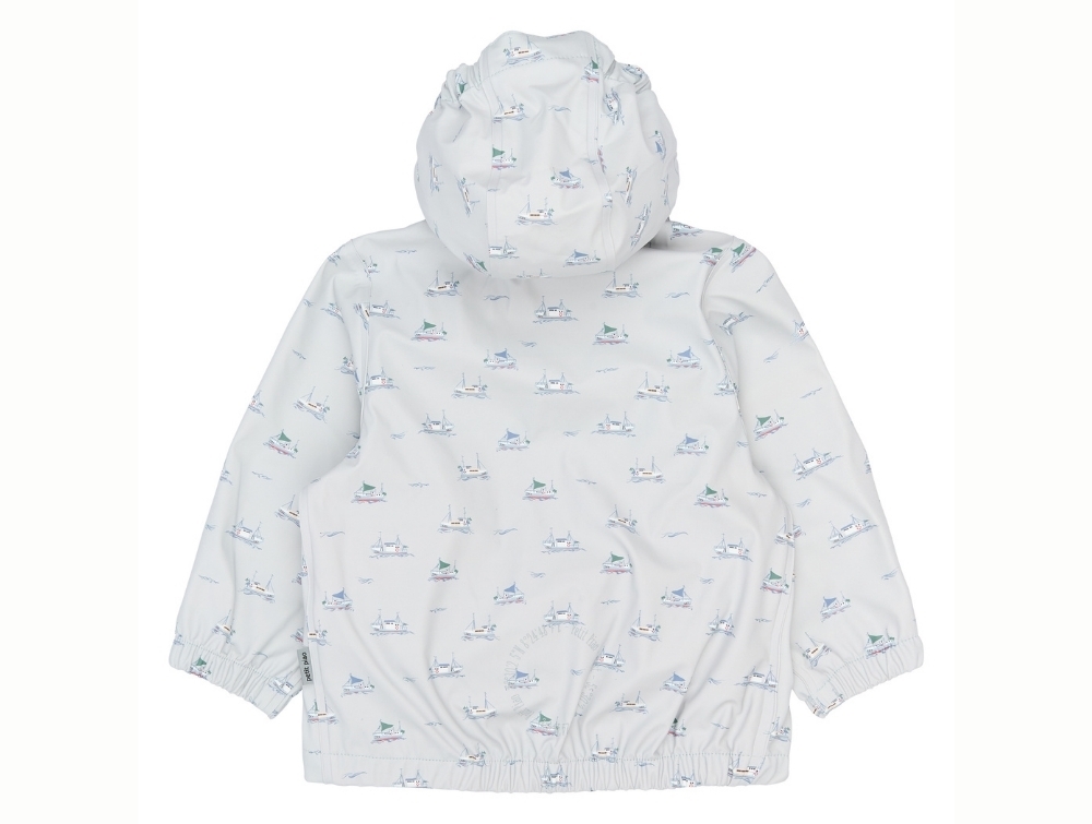 Petit Piao regnsæt i lys grå nuance med bådprint og blå bukserPetit Piao regnjakke i lys blå nuance med bådprint set bagfraPetit Piao regnjakke med aftagelig hætte og bådprint åbnetPetit Piao blå regnbukser med seler og refleksPetit Piao regnbukser med seler detalje