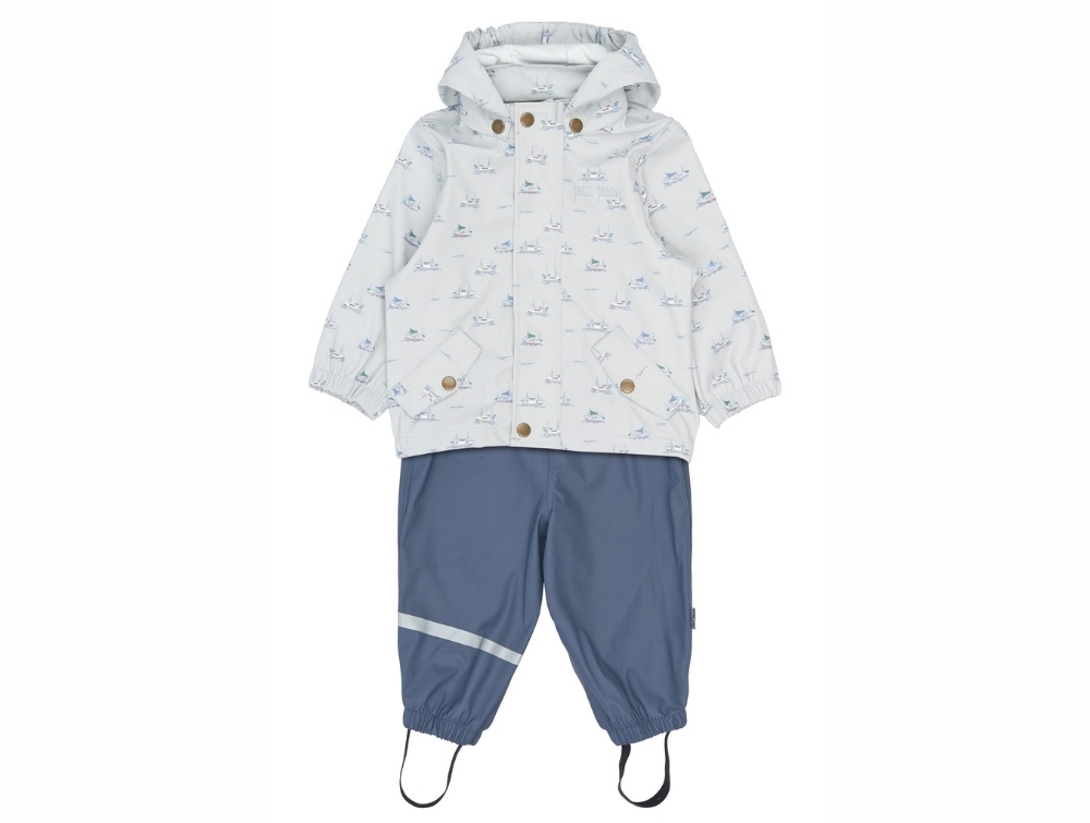 Regnsæt i lys blå nuance med bådprint (Pearl Blue Boat) fra Petit Piao, kombineret med ensfarvede blå regnbukser med seler.
