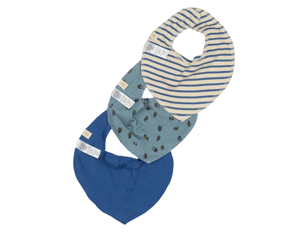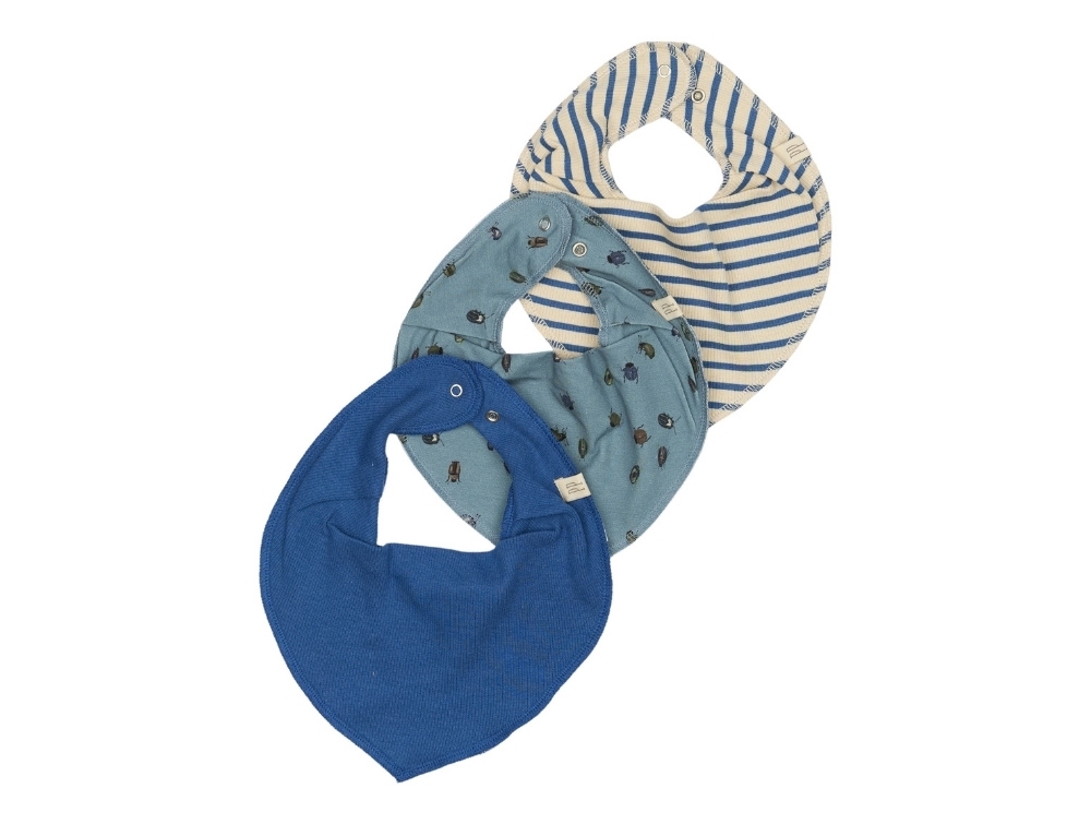 3-pak savlesmække i blå og naturfarvede nuancer fra Petit Piao. Pakken indeholder én med billeprint, én med striber og én ensfarvet i rib.