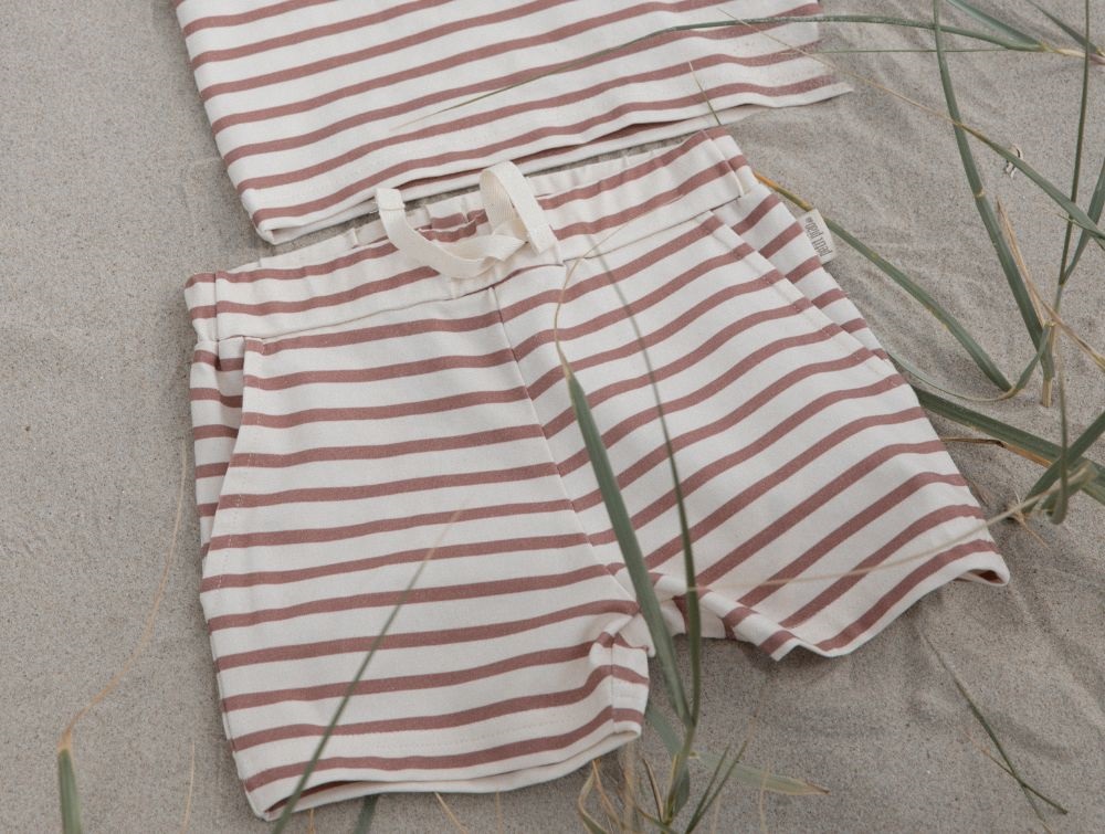 Råhvide og mørk rosa stribede shorts med sidelommer og bindebånd fra Petit Piao PP1708 withered roseRåhvide og mørk rosa stribede shorts fra Petit Piao PP1708 withered roseråhvid og mørk rosa stribede shorts fra Petit Pia liggende i sandet på en strand PP1708 withered rose