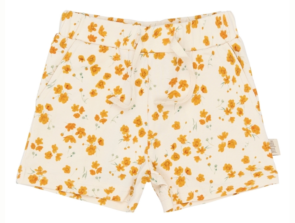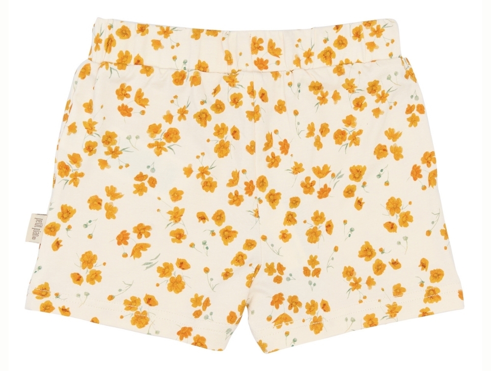 Shorts i råhvid nuance (Eggnog Buttercup) fra Petit Piao med et fint allover buttercup-blomsterprint i varme gule nuancer.