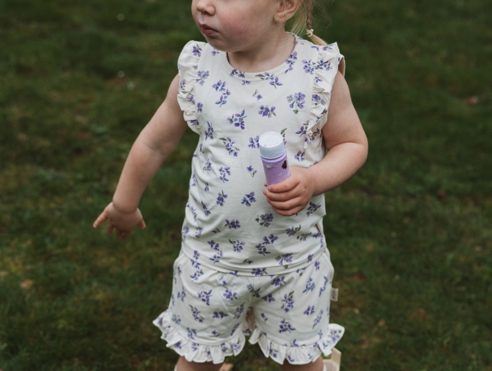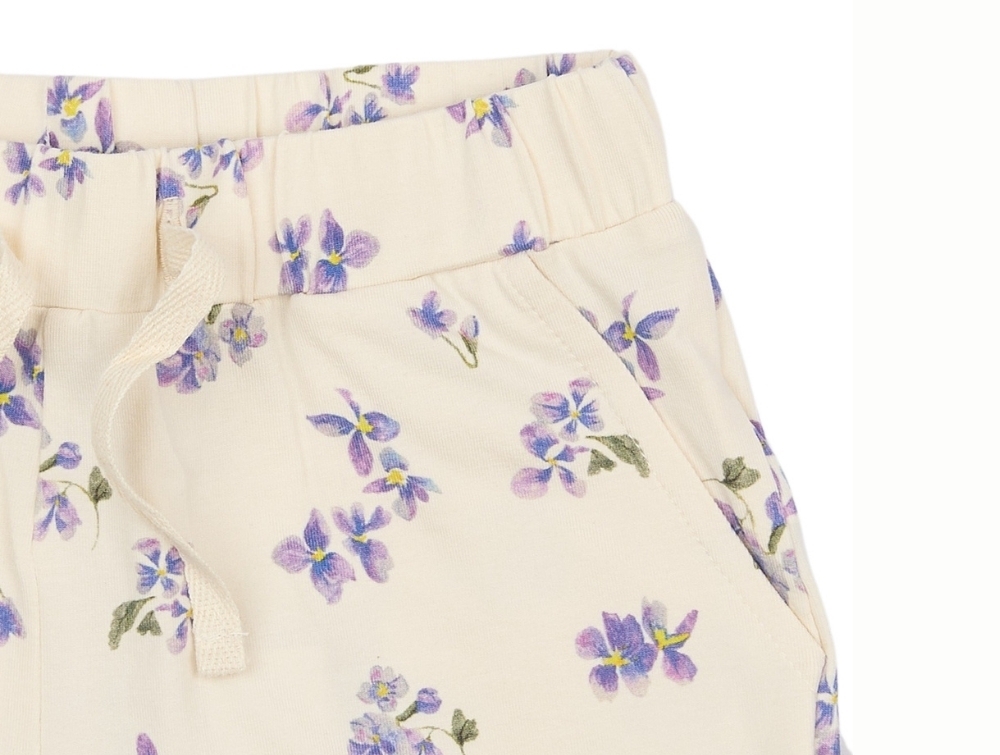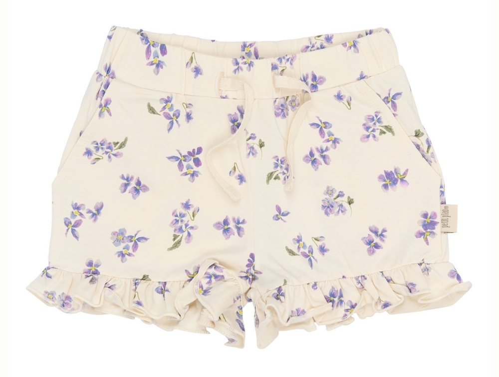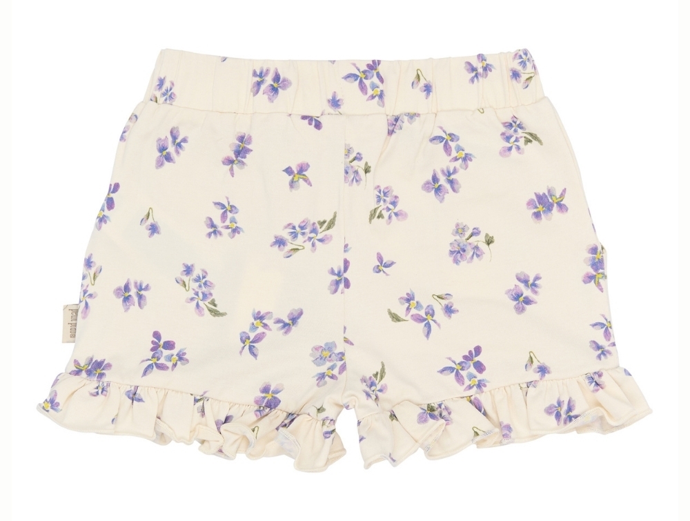 Shorts i lys råhvid nuance (Eggnog Viola) fra Petit Piao med små akvarel-violetter og fine flæser nederst.