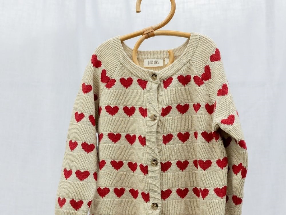Strikcardigan i beige med rødt hjertemønster fra Petit Piao.