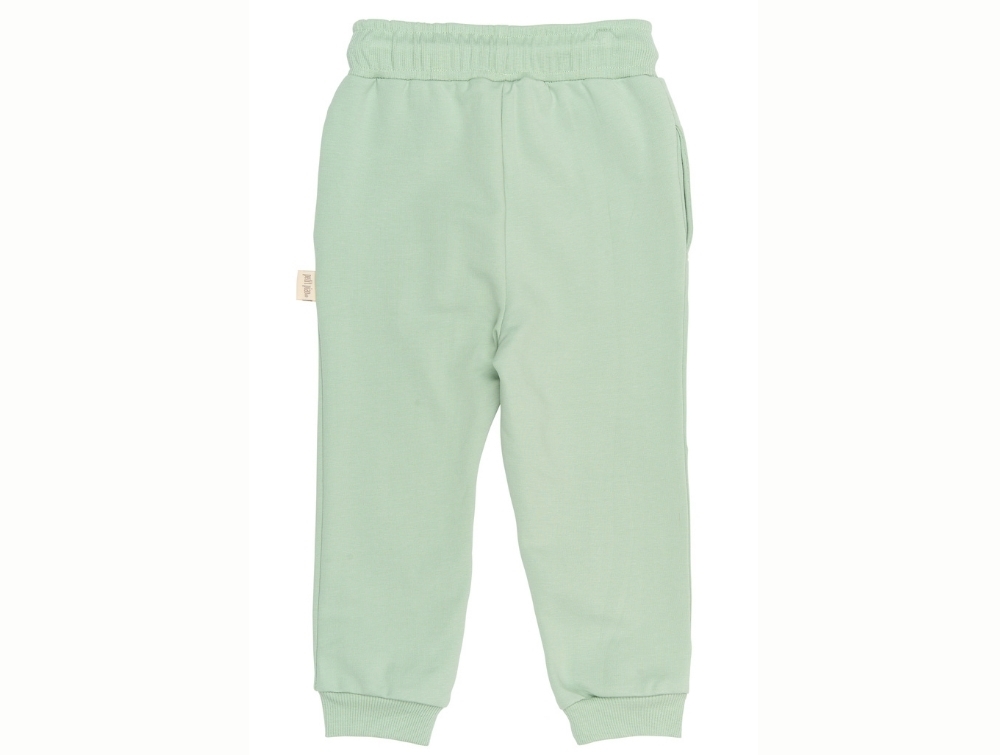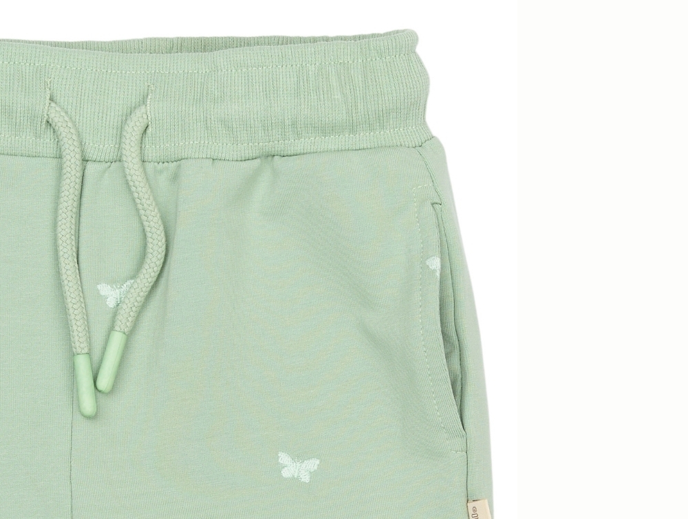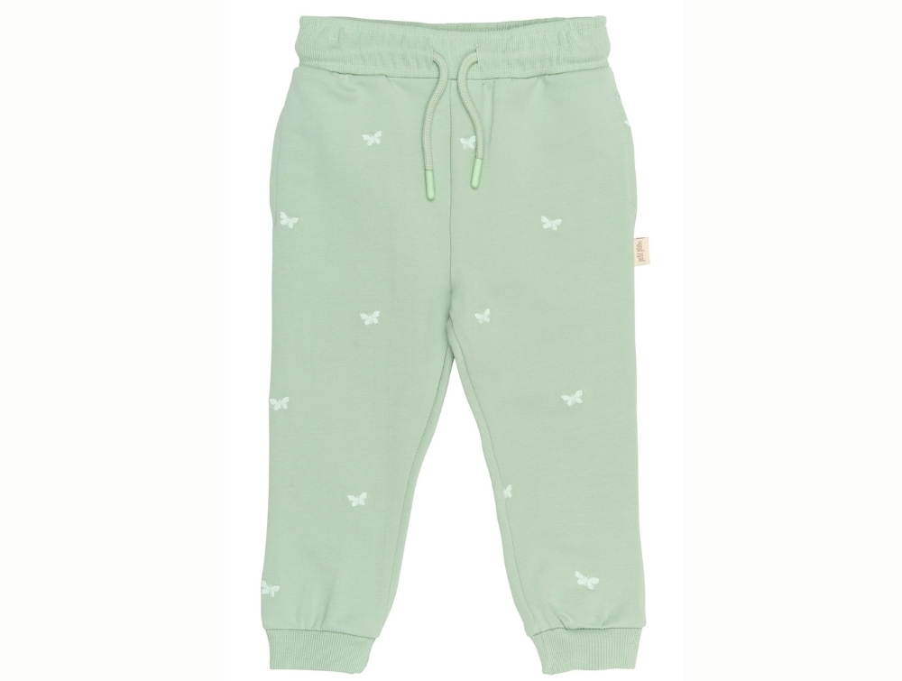 Sweatpants i lysegrøn nuance (Frosty Green Butterfly) fra Petit Piao med små broderede sommerfugle og justerbar talje.