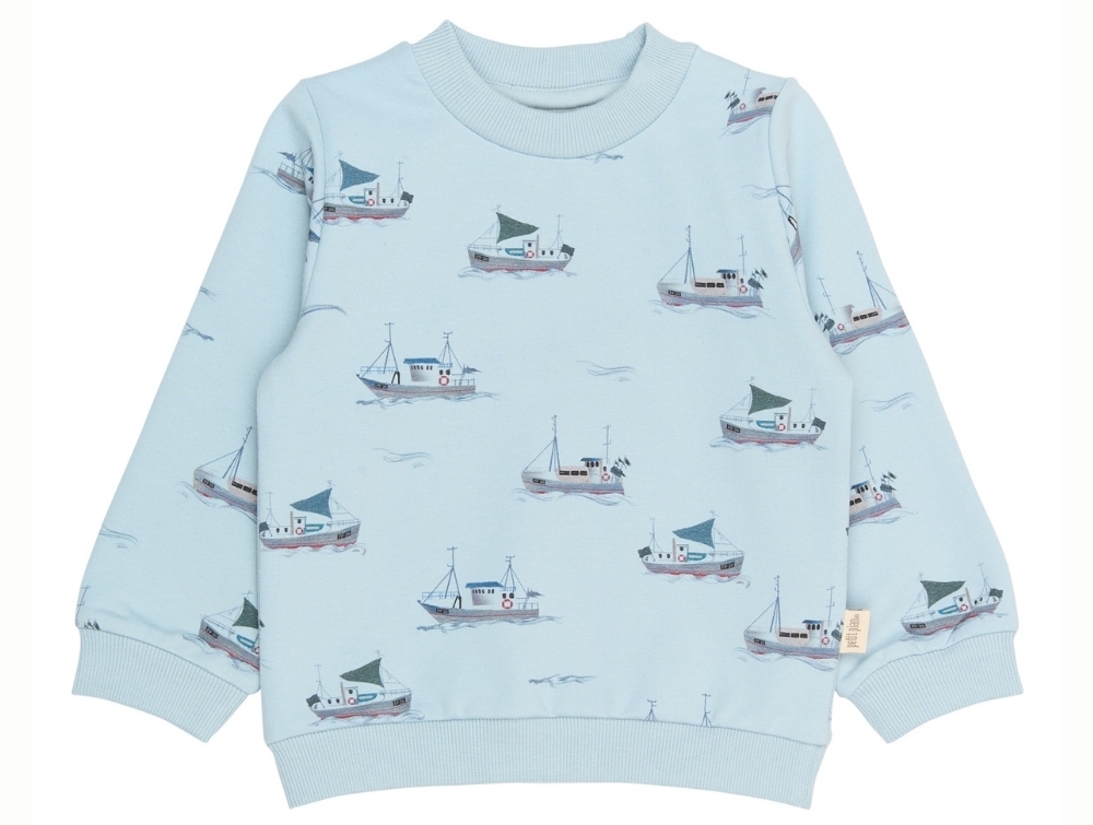 Sweatshirt i lyseblå nuance (Celestial Blue) fra Petit Piao med et detaljeret print af små både og fiskekuttere.