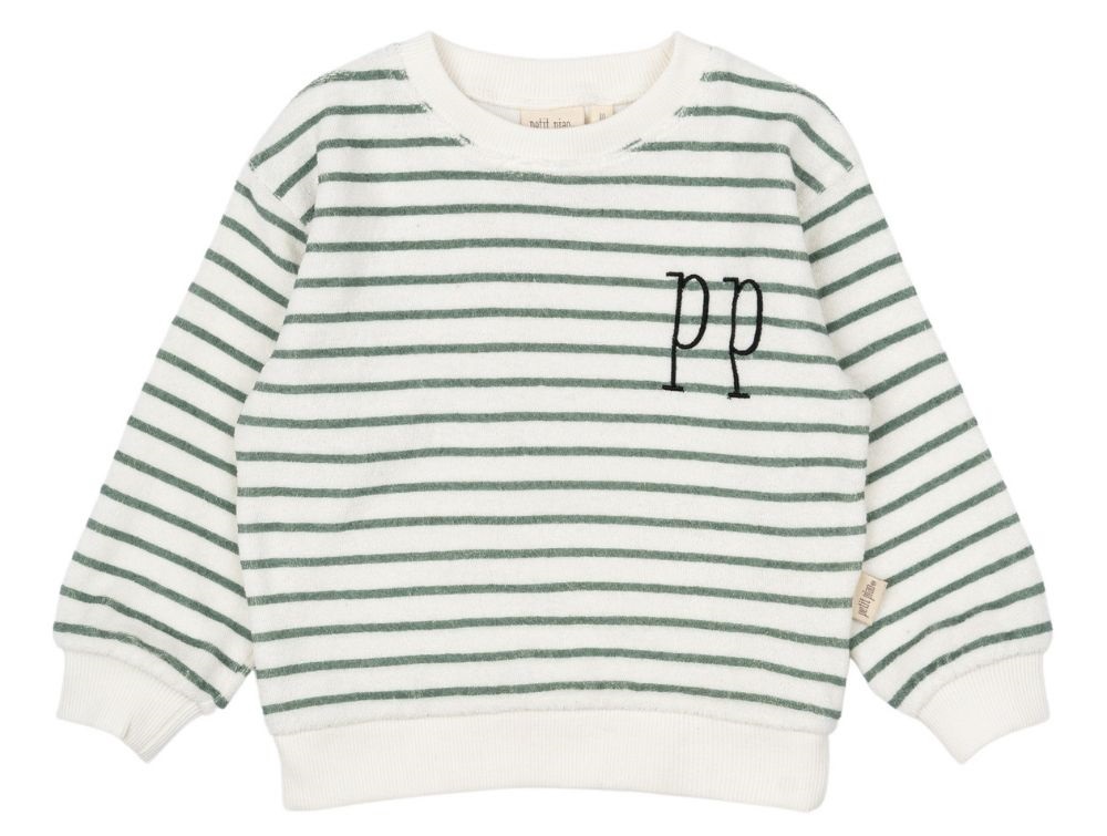 Blød sweatshirt i strækbar frottékvalitet med printede grønne striber og broderet Petit Piao-logo i mørkeblå på brystet.