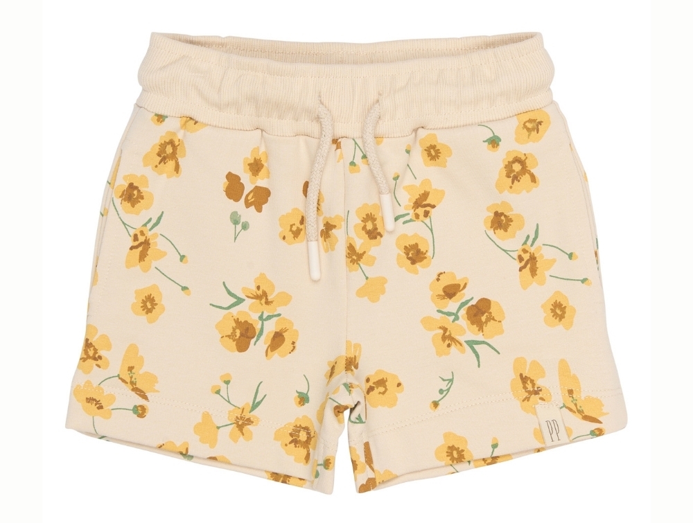 Sweatshorts i råhvid nuance (Fog Buttercup) fra Petit Piao med et smukt allover blomsterprint.