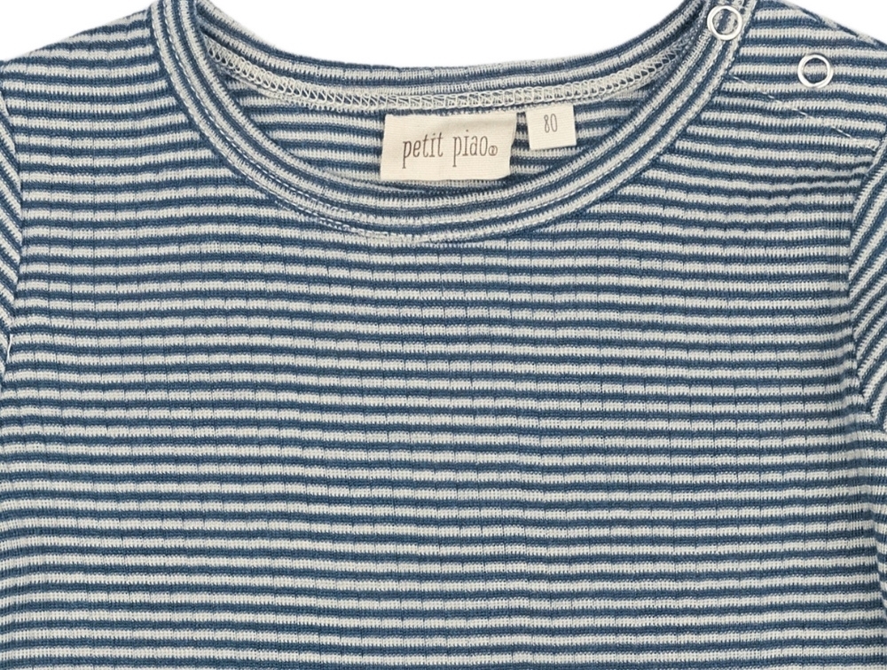 Denne T-shirt er lavet i Petit Piaos klassiske stribede merinouldskvalitet, som er blød og strækbar med god bevægelighed. Modellen har trykknap ved halsen for nem påklædning (kun til og med str 92) og pasformen er almindelig.