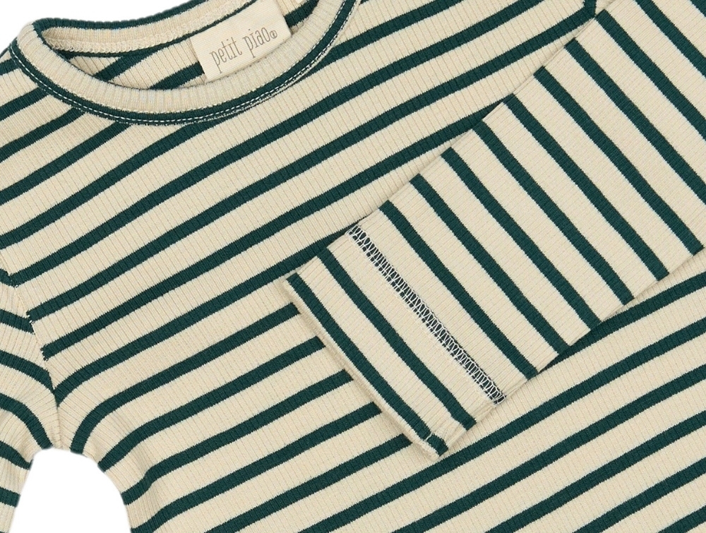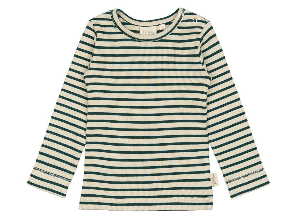 Denne T-shirt er lavet i Petit Piaos klassiske stribede ribkvalitet med blødt og strækbart materiale, der giver god bevægelighed. Størrelserne 74-92 har trykknaplukning i skuldersømmen for nem påklædning, mens de større størrelser er uden knapper.
