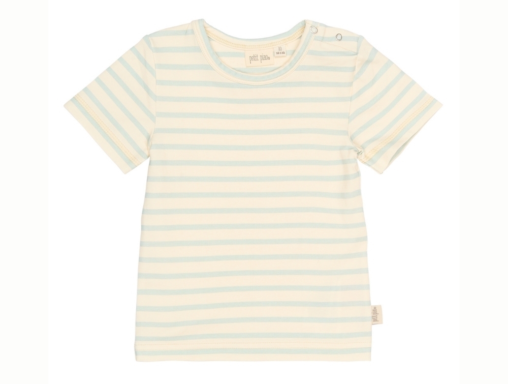 T-shirt i råhvid og lyseblå stribet nuance (Winter Sky Striped) fra Petit Piao med et klassisk og sommerligt udtryk.