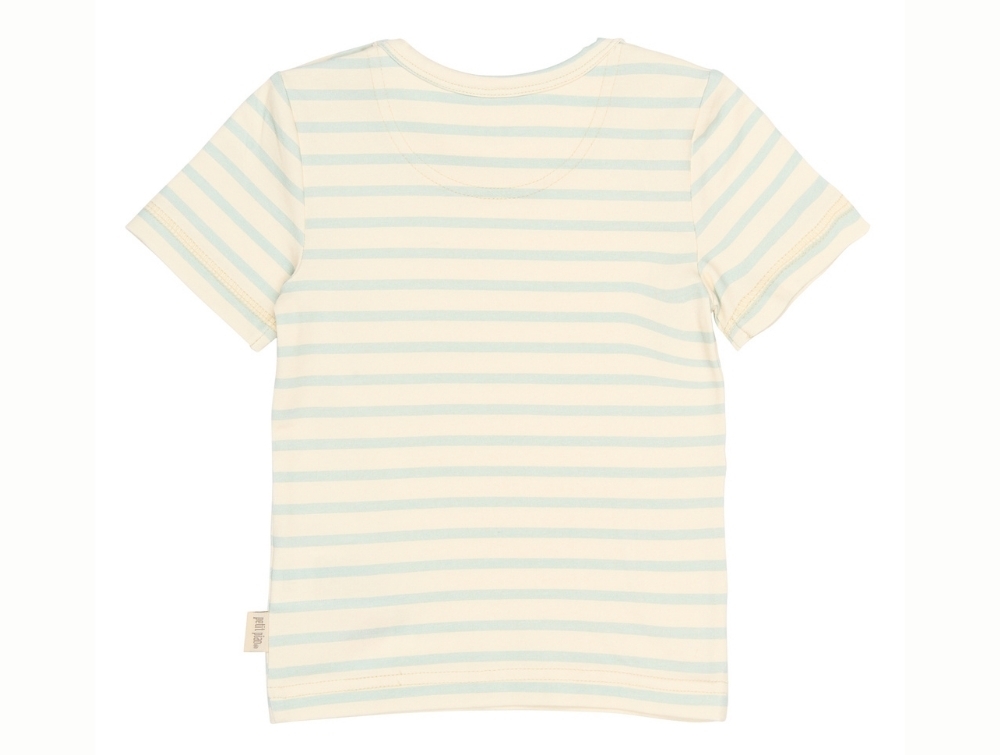 Petit Piao t-shirt råhvid med lyseblå striber forfraPetit Piao t-shirt råhvid med lyseblå striber detaljePetit Piao t-shirt råhvid og lyseblå striber bagfra