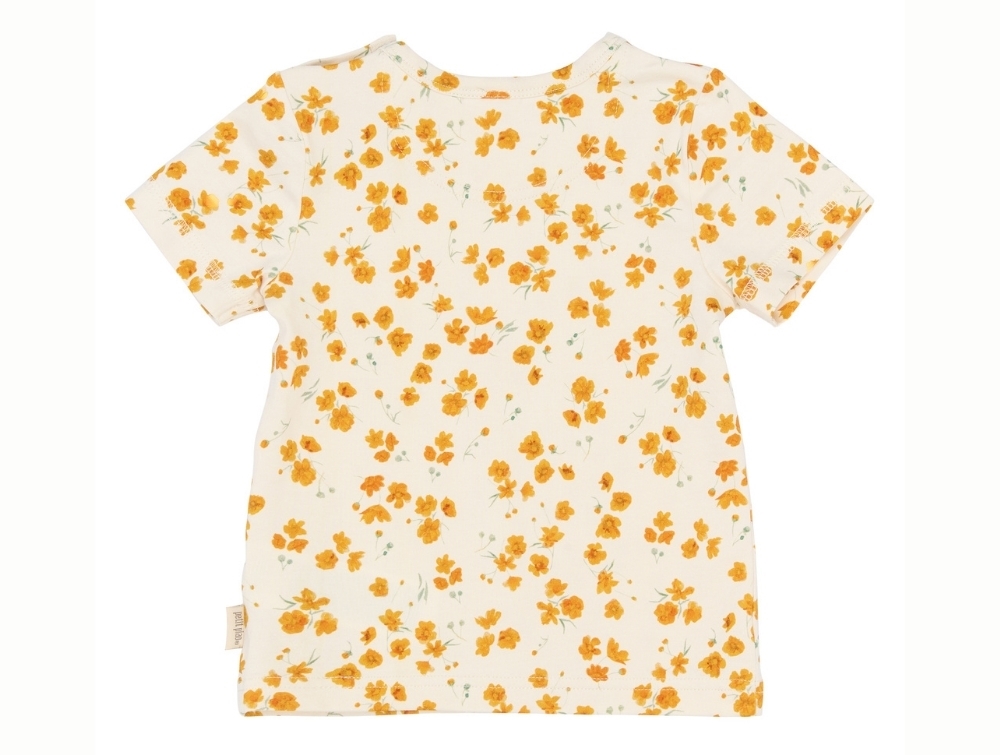 T-shirt i råhvid nuance (Eggnog Buttercup) fra Petit Piao med et smukt akvarel-inspireret blomsterprint i varme gule nuancer.