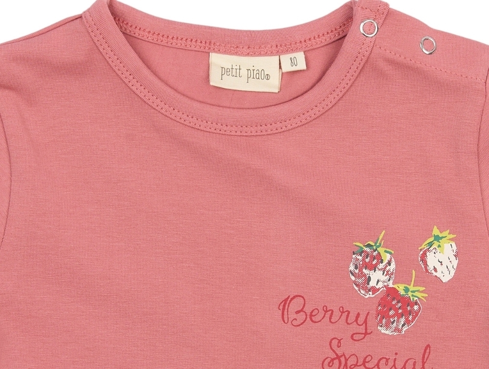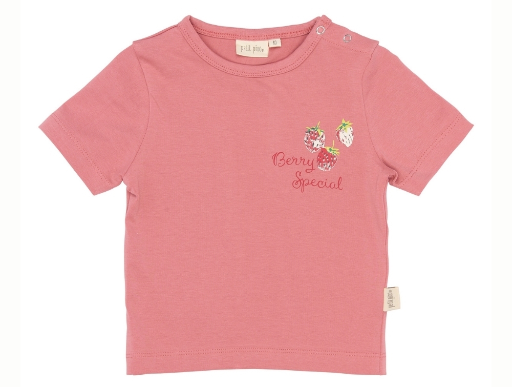 Kortærmet t-shirt i rosa nuance (Dusty Rose) fra Petit Piao med et fint lille “Berry Special”-print og tre små jordbær på brystet.
