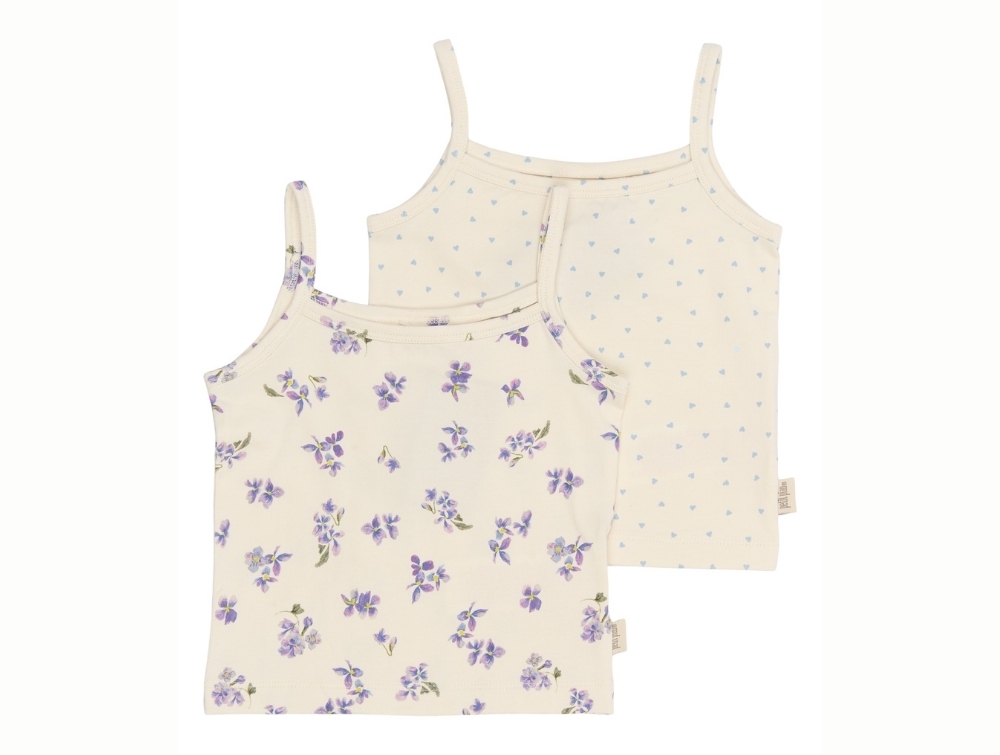 Sættet består af én råhvid undertrøje med et fint akvarelprint af lilla violer og én råhvid model med små blå hjerter.