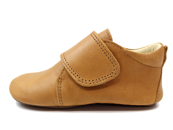 Camelfarvede skindhjemmesko fra Pom Pom. Hjemmeskoene er bløde i skindet og har en superfleksibel og skridsikker gummisål. Lukkes nemt med velcrorem.