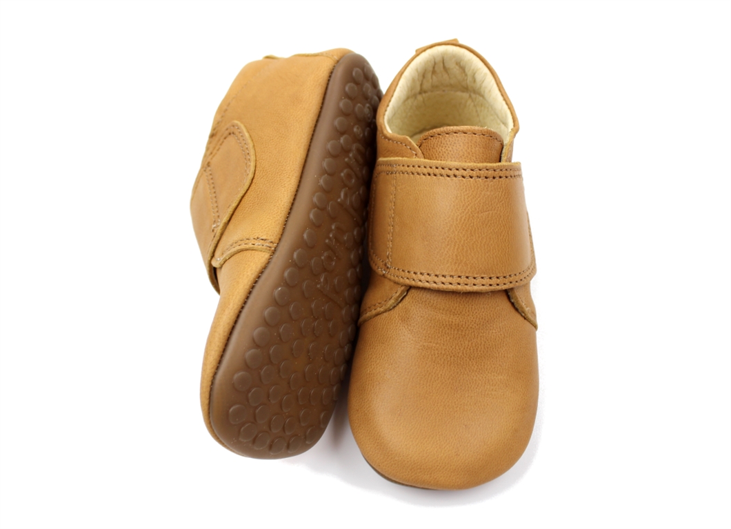 Camelfarvede skindhjemmesko fra Pom Pom. Hjemmeskoene er bløde i skindet og har en superfleksibel og skridsikker gummisål. Lukkes nemt med velcrorem.