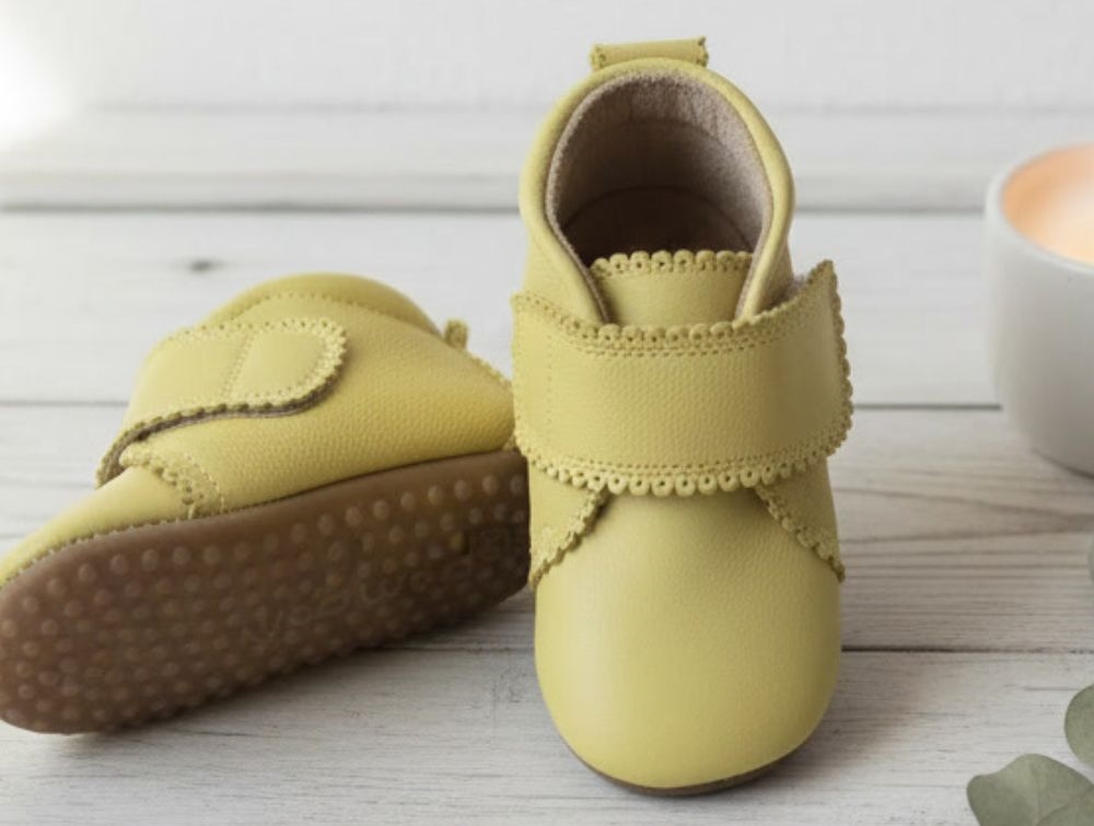 Gule hjemmesko med hulmønster fra Pom Pom. Hjemmeskoene er bløde i skindet og har en superfleksibel og skridsikker gummisål. Lukkes nemt med velcrorem. Bemærk at målene på hjemmeskoene kan variere nogle millimeter fra sko til sko. Skoene er generelt små i størrelsen. 100% vegetabilsk garvet inderside. Ingen krom, tungmetaller eller kemikalier.