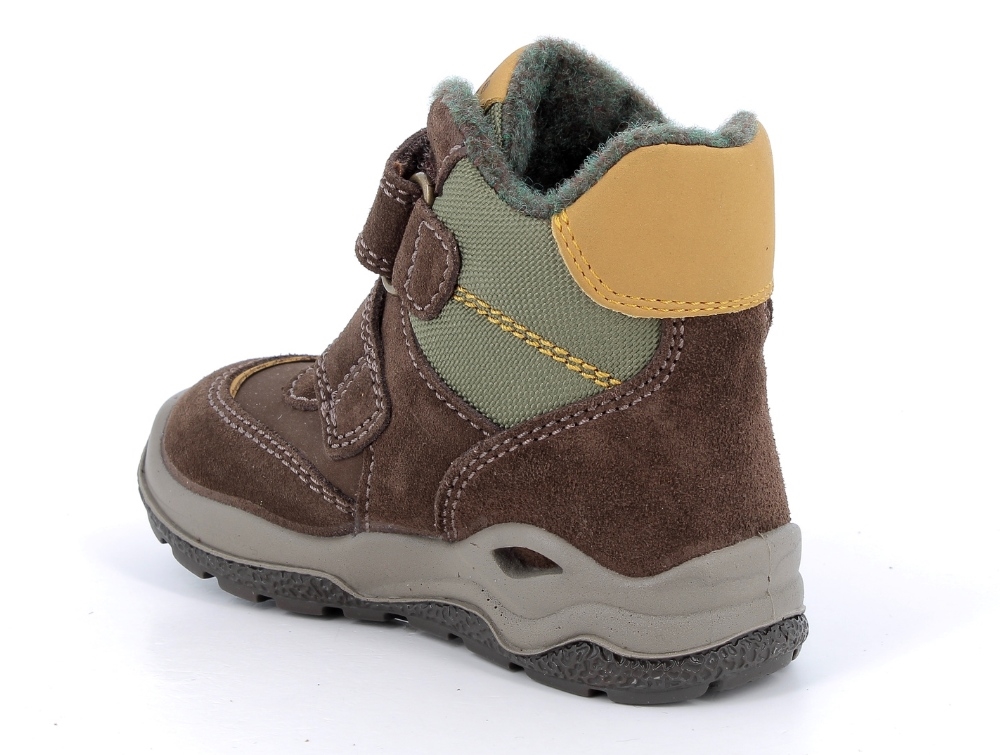 Vinterstøvle i brun og oliven fra Primigi. Outdoor-inspireret design, der beskytter mod kulde og fugt. Modellen har to velcroremme, så den er nem at få af og på, og en polstret krave, der giver ekstra støtte til anklen. Ydersålen er robust og udformet, så den giver godt greb ved leg.