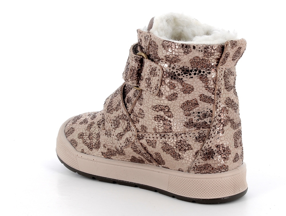 Vinterstøvle med leopard- og glitterprint fra Primigi. Modellen er designet til de mindste piger og har to velcroremme, så den er nem at tage af og på. Overdelen i præget skind med glitrende leopardmønster giver støvlen et festligt look, mens den praktiske gummiforstærkede underdel beskytter mod vand og snavs. Støvlen er super let og ergonomisk udformet, så barnet kan bevæge sig frit.
