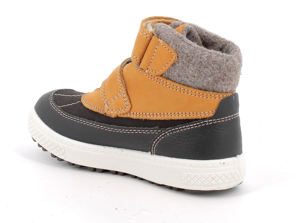 Vinterstøvle i gul og sort fra Primigi. Modellen er udstyret med to velcroremme, så den er nem at tage af og på. Den nederste del af overdelen er forstærket med gummi, hvilket giver ekstra beskyttelse i vådt og mudret vejr. Støvlen er let i vægten og har en ergonomisk form, der støtter foden på en naturlig måde.