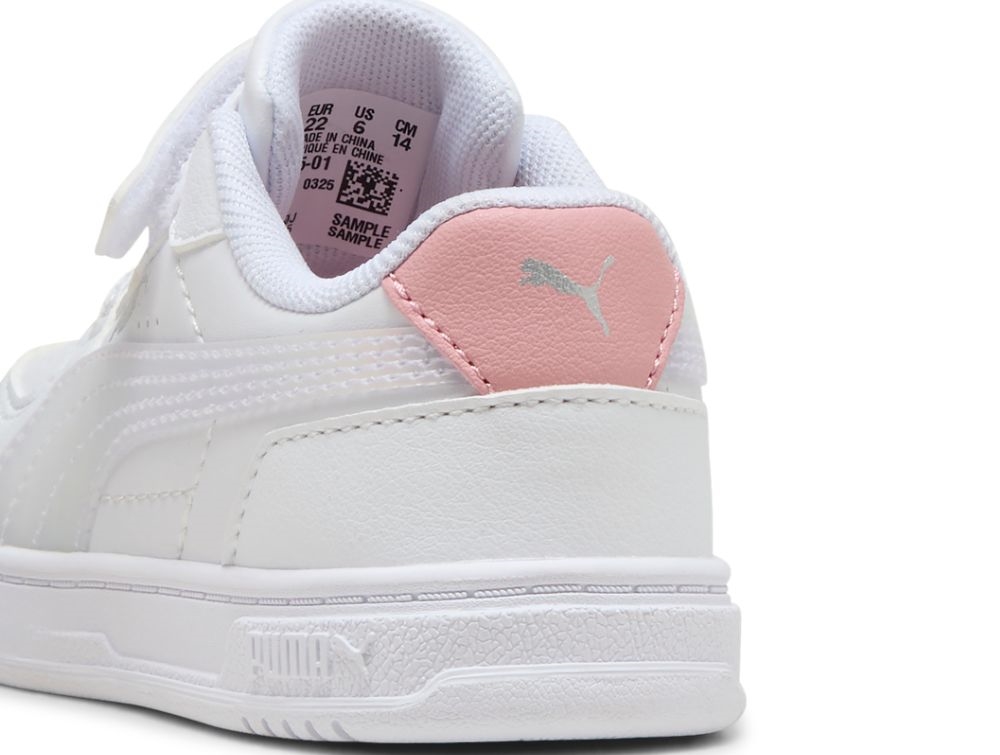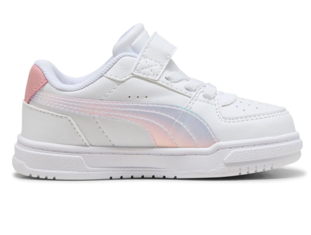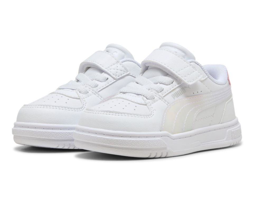 Puma Caven III Holo 2.0 AC+ Inf er en hvid sneaker med fine holografiske detaljer og rosa hælkappe, designet til de mindste børn. Modellen har et klassisk court-inspireret look kombineret med praktisk velcrolukning, som gør skoen nem at tage af og på.