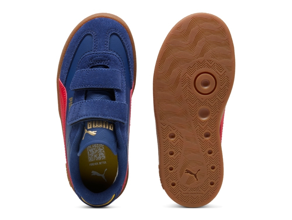 Sneaker i navy nuance fra Puma med markant rød sidepanel og klassisk gummisål. Modellen har to velcroremme, der gør skoen nem at tage af og på – ideel til aktive børn i skole og fritid.