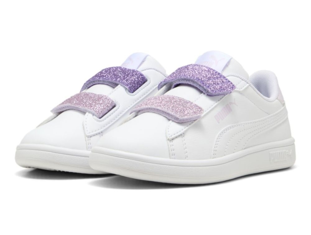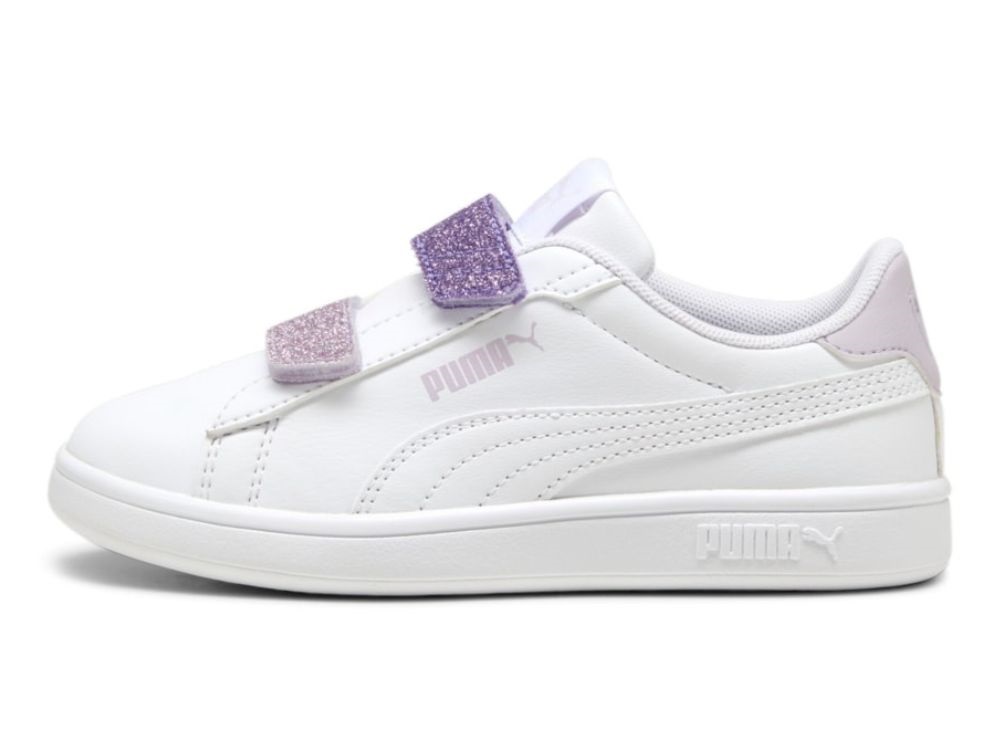 Klassiske sneakers fra Puma med en hvid overdel i syntetisk læder og velcrolukninger med lilla glimmer, der tilføjer et fint touch. Modellen har en tidløs tennissilhuet med rene linjer og Pumas ikoniske formstrip på siden.