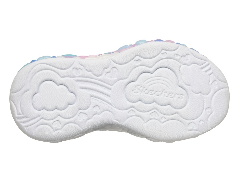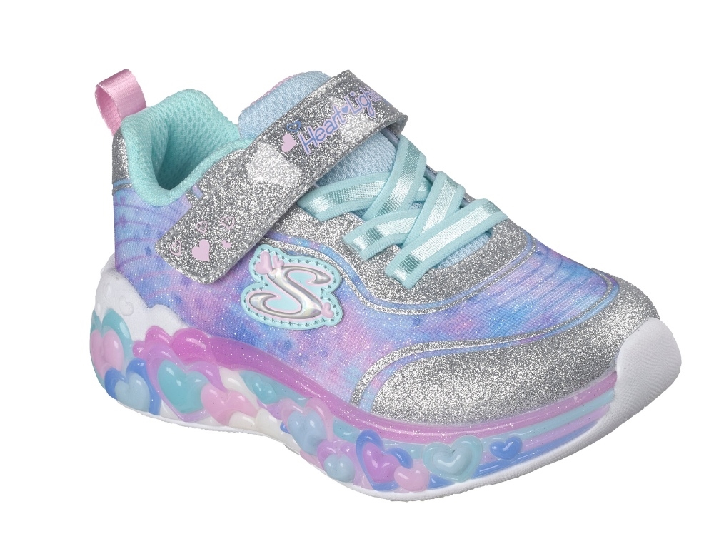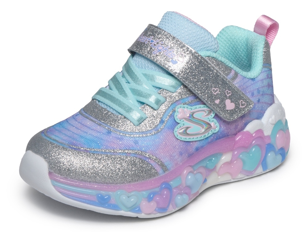Sneaker i sølv nuance fra Skechers. Modellen Eternal Heart Lights har glimmer-detaljer og et farverigt mønster i blå og lilla nuancer. I mellemsålen ses små hjerteformer, som lyser op ved bevægelse og giver skoen et iøjnefaldende udtryk under leg.